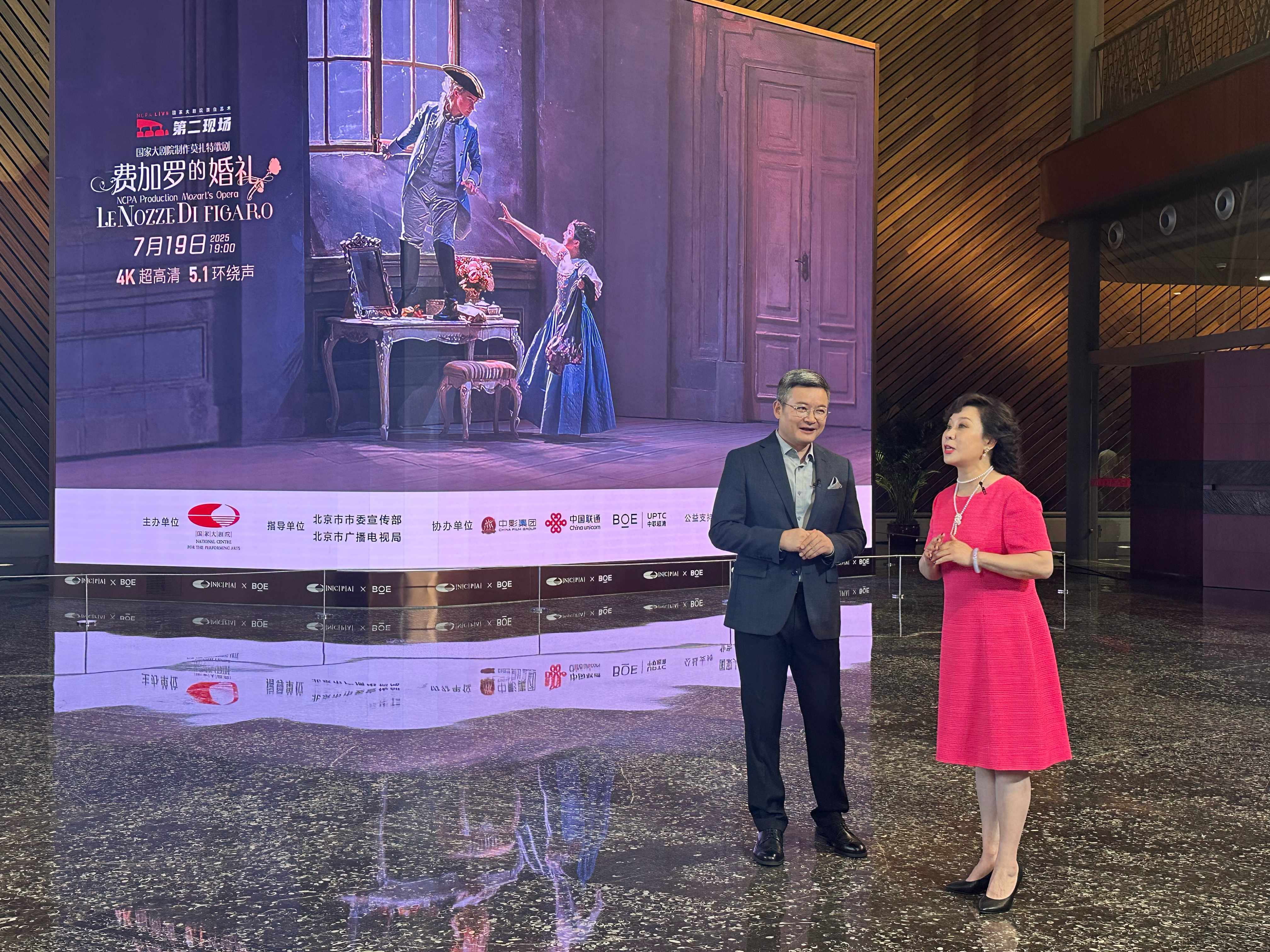 7月19日,主持人李佳明(左)与女高音歌唱家张立萍(右)为观众讲解歌剧《费加罗的婚礼》。新华社记者 杨淑君 摄据介绍,歌剧《费加罗的婚礼》总谱长达730余页,包含近3000个需要精准衔接的镜头,对直播技术提出了极高要求。